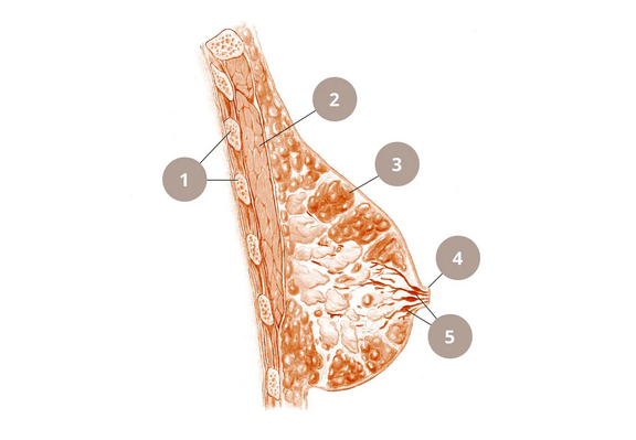 Image de la ligue suisse contre le cancer : 1. côtes 2. muscles pectoraux 3. tissu adipeux 4. mamelon 5. canaux excréteurs des glandes mammaires